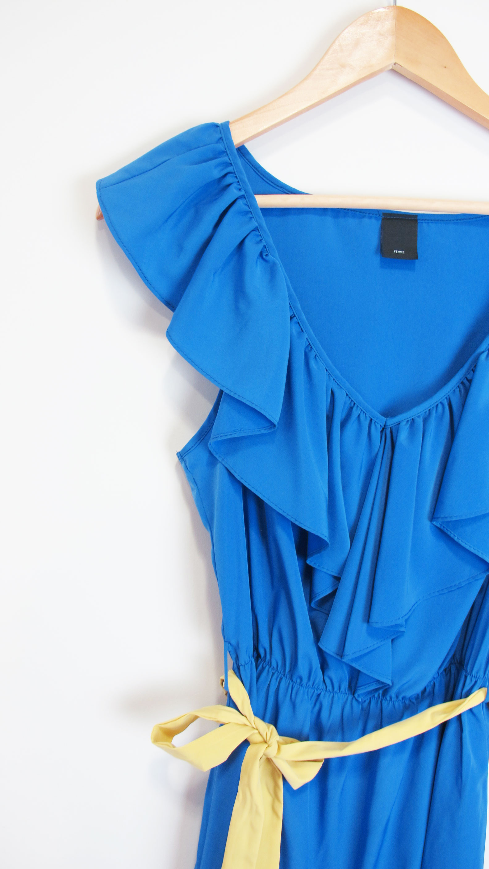neckline that comes in a ruffle front trimming. The pop colored sash