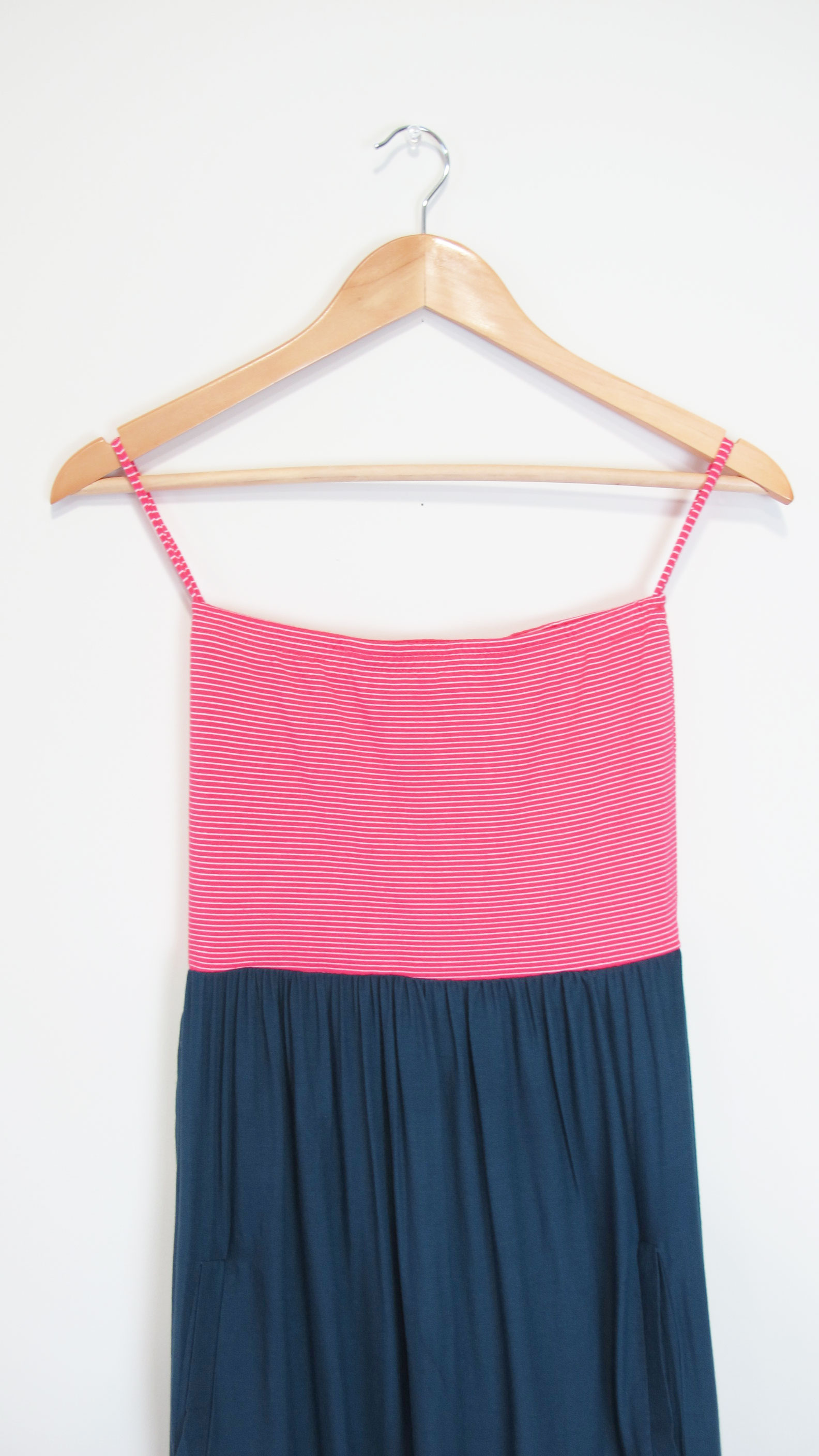 this Pin stripe bust / solid bottom maxi dress w/ pockets. Chic color